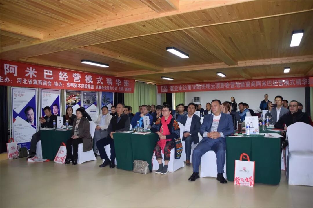 10月20日,由河北省冀商商会主办,杰明投资控股集团、永泰企业咨询公司协办的“冀企走访第16站杰明云顶野奢营地暨冀商阿米巴经营系统精华班”圆满举办。商会会长、海鹰环境科技董事长董跃中、商会顾问冯勇、商会执委兼副会长、河北兆泓集团董事长王书翠、恒晨源医疗器械董事长高恒阳、美开视觉设计总经理渠汀、副会长杰明投资控股集团李月、河北华隆集团董事长王志和、河北瑞泰塑业董事长赵永利、大泽堂红木艺术馆董事长张泽军、沃舜传媒总经理李亚、商会邯郸服务中心会长姚永献、商会秘书长易耀等商会领导和会员企业负责人60多人参加了此次活动。